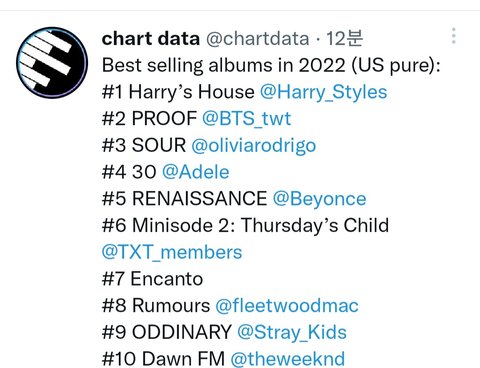 ╋) 올해 미국에서 제일 많이 팔린 앨범 (방금 올라옴) 2위 방탄, 6위 투바투, 9위 스트레이키즈