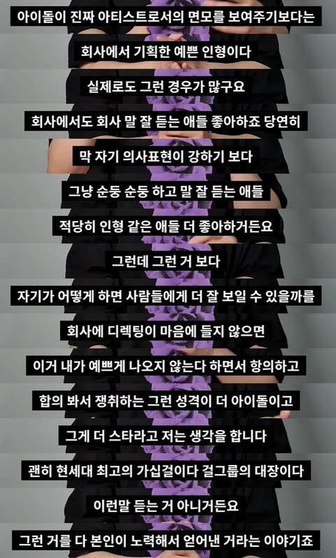 역시 영악하네 대중들은 실력보단 외모를 더 중요시한다는 걸 알고 노래연습 춤연습 재껴두고 표정연습, 어떻게하면 더 잘 나오는지만 연습한다는 거 아니냐ㅋㅋㅋ 천상아이돌 인정ㅇㅇ 근데 저렇게 살거면 인플루언서나 하는 게 더 나은 삶일듯