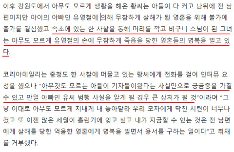 3. 유영철 아들은 정말 의외로 본인이 그 살인범 유영철의 아들이란 사실을 모른다고함. 유영철 전 부인이자 어머니인 황씨가 호적을 파고, 개명을 시키는등 실로 처절한 노력을 했다고.. 사건 이후 기자들이 하도 찾아와서 지방 시골로 이사갔다는 점도 크게 적용한듯. 이후 평범하게 대학도 나오고, 군대 제대도하고 지금은 직장생활 하고있다고함. 유영철 전 부인은 출가해서 비구니가되어 전 남편에게 살해당한 피해자들 명복을 빌어주는중. 유영철 아들만큼은 부디 어머니 성품을 닮았기를 빈다