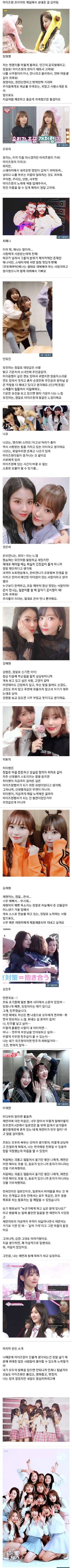 *다른 멤버들이 워낙 대놓고 화려하게 이쁜 사람이 많다보니 조유리 팬덤이 잘 이해 안된다는 얘기가 많은데 영상으로 보면 말투나 행동이나 엄청 귀엽다. 김채원처럼 자기가 의도하지 않았는데 묻어나는 귀여움이 있음.