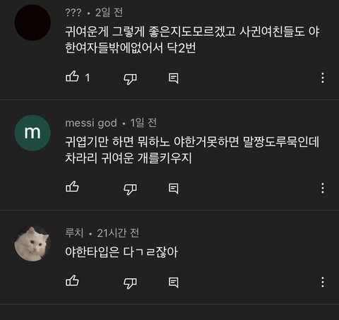 유튜브에 이런게 다 뜨냐 애들도 보고 할텐데 진짜 저 계정도 정신 나갔고 댓글도 소름돕고 개더러움 진짜 댓글보면 막 미자 먹고싶다 이러고 있고 가출한 애들 먹어라 막 이런 댓글도 있음 한번씩 들어가서 채널 신고좀 하자 진짜 ㅜㅜㅠㅠㅠㅠㅠ