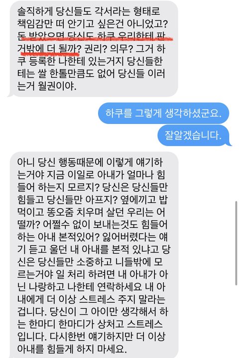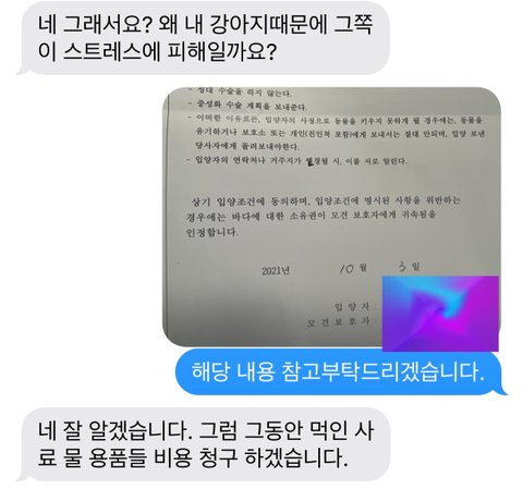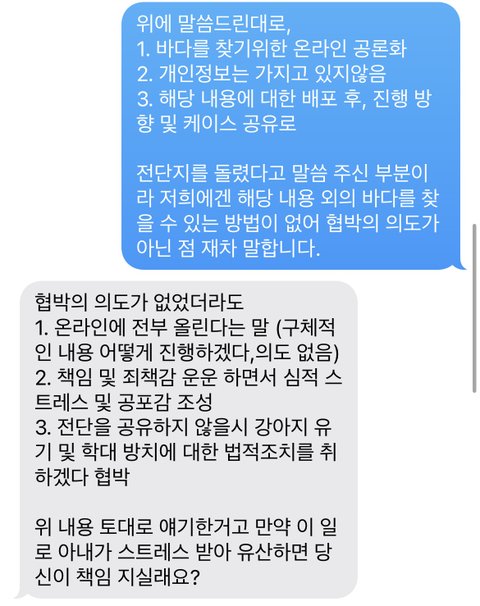 전단지 및 방송을 했다고 하셔서 전단지 내용 요청드렸으나, 내일 보내준다고 하시네요..적극적으로 바다를 찾지 않은 것 같아서 너무 화가나, 온라인 게시 및 법적처리 하겠다 등등의 내용으로 말했더니 법무사 알아봐서 똑같이 법적조치 할거라고 말하네요.. 협박 및 그동안 키우고 보살핀 비용 청구 등... 오히려 각서를 통해 저희가 책임감을 떠넘겼고 돈주고 판거아니냐고 하시네요.과연 아이를 사랑으로 키운 사람에게서 나올 수 있는 말일까 생각이 들어 너무 답답하고 참담합니다.