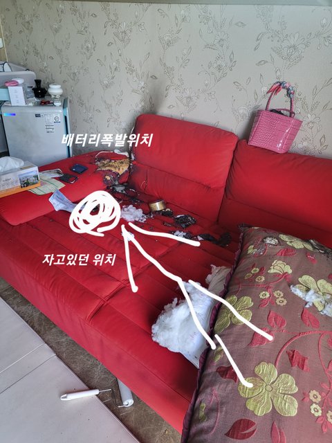 불은 베개로 쳐서 진압했고 쇼파에 잔 불씨가 있어