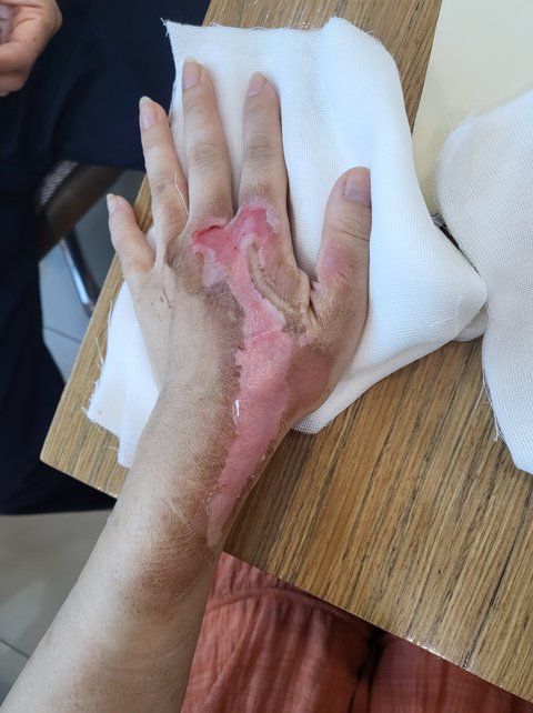 흐르는물로 응급처치 후 바로 응급실로 이동하였습니다.