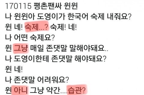 때는 2017년 윈윈 입사하고 한국어 거의 못했을때 즉, 제대로 표현하기 어려울때 숙제라고 하는데 윈윈입장에선 숙제: 자신이 해야하는일 이라고 이해하고 도영한테 형이라고 불러야되구나라고 인지한거임 즉, 도영이 뭘시켜서 이거해라 저거해라~가 아님 도영이 윈윈보다 형인데 그럼 반말하리..? 이것도 억까