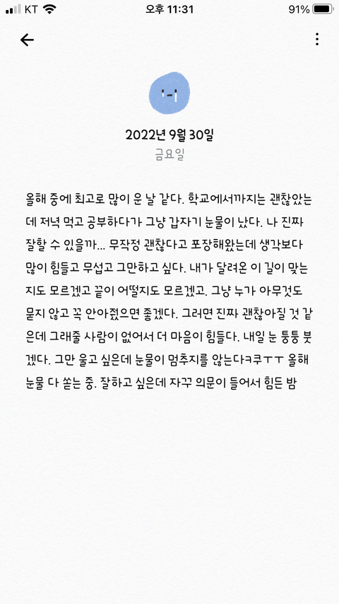 이때 걍 뭐가 그렇게 힘들었는지 진짜 새벽에 저거 쓰면서도 엄청 울었음 근데 다시 일상 복귀해서 공부만 조지니까 오히려 정신건강은 나아지는 것 같음 뭔가 몰두해서 열심히 하면 몸은 힘든데 죄책감이나 불안감을 덜하는 것 같아 수험생들 다들 파이팅이당