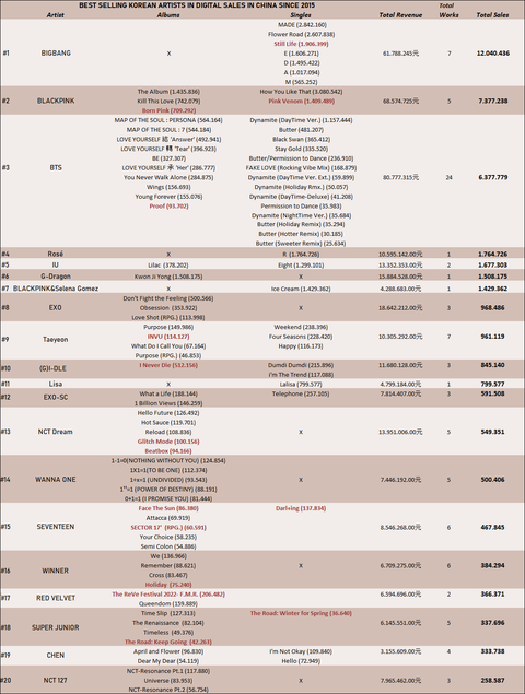 이건 중국에서 가장많이팔린 kpop앨범 및 싱글 목록 여기에는 모든 케이팝가수들 포함임.