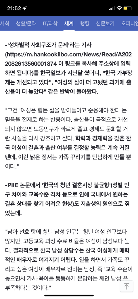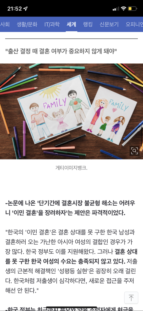 고학력한국여자들은 적어도 한국남자랑은 결혼할생각이 없어보이니 한국여성을 주축으로 이민남성받아서 국제결혼추진하라는식으로 해결책 제시해줌 ㅋㅋㅋㅋ 근데 이결론마저 한남들이 부정할거라고 예측한거까지 완벽하게 예측 ㅋㅋㅋㅋㅋㅋ