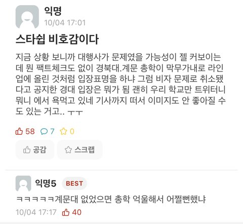 아이브 관련해서 말 많던데 솔직히 스타쉽쪽에서 어떤 입증할만한 자료도 안 올려놓고 너무 두 학교 총학 매도하듯이 글 올리긴했음 상식적으로 두 학교 다 계약도 안 해놓고 라인업에 올려둘 확률이 얼마나 되겠음?