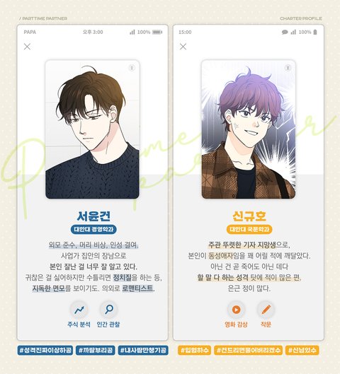 나 믿고 파트타임 파트너 봐라 이거 지금 웹툰으로 연재되고 있고 소설도 있는디 ㄹㅇ 존맛임 걍 첨에 살짝 답답할 수도 있는데 참고보셈 ㄹㅇ 수는 진짜 사랑이란걸 딱히 해본 적 없고 가볍게 사람 만나고 가볍게 헤어지고 하던 애고 공은 조카 딱딱하고 재수없던 새끼인데 둘이 찐사 되고 공이 질투 많아지고 이런게 ㄹㅇ 개존맛임 ㅅㅂ 암튼 걍 꼭봐라 꼭 꼭 꼭 꼭 봐 내가 설명을 잘 못하는데 ㄹㄴ 개존맛