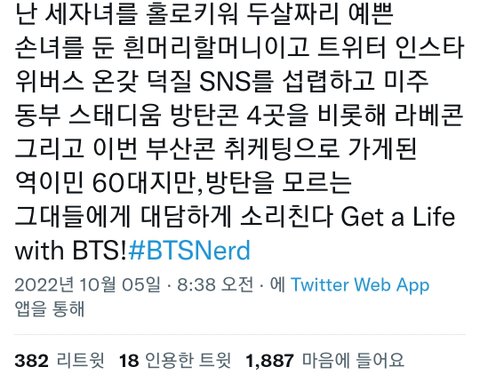 외퀴들이 라디오 디제이가 방탄 차별발언한거 대응하려고 쓴건데 어쩌다가 줌풍당당해시로 변질된거지... 진짜 주책이고 튀고싶은게 보여서 눈물남