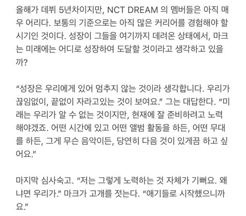 마지막 심사숙고. "저는 그렇게 노력하는 것 자체가 기뻐요. 왜 냐면 우리가 마크가 고개를 젓는다. "애기들로 시작했으니까 요"