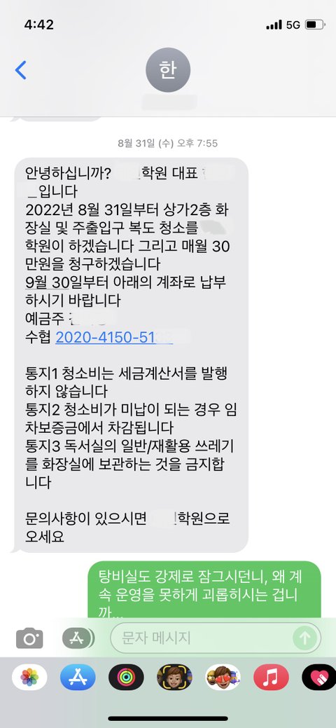4. 독서실 일부 강제 폐쇄함. (건물 화장실 청소 매일 하는데, 결과물이 맘에 안든다고)