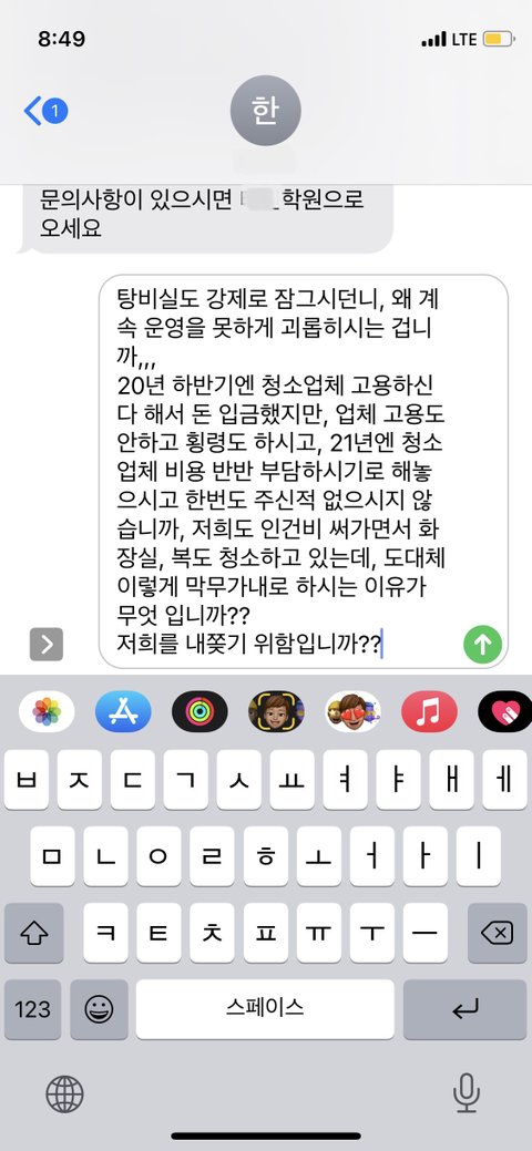 옆 학원 원장님이 자꾸 괴롭히셔서 직원들도 힘들어서 울고 그만둬서.. 참다참다 사장님께 말씀을 드렸어요.