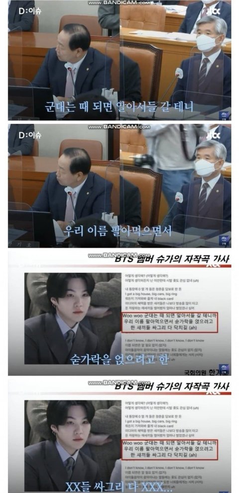 ?저거말고도 기자회견에서 타니들이 군관련 질문에 부르면 간다고 했음 슈가는 안가겠다고 말한 적 없고 때되면 가겠다고 가사에서도 지금 상황에서도 똑같이 말했는데 왜 지 발등 지가 찍었네야? 이해ㅎㅌㅊ 티내지마