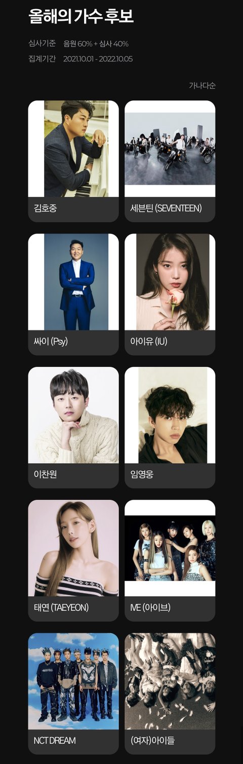1. 올해의 가수에 드림, 세븐틴은 후보에 들어가는데 왜 방탄, 블핑은 안들어감? 음반, 음원 모두 방탄, 블핑이 더 성적이 좋은데 무슨 기준임?