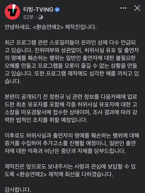 프로그램 방영 전에 현규 프로필 뿌린 게 잘못은 맞지만 고소할 것까지 있나? 그 사람들이 뿌린 현규 스펙때문에 환연 화제성도 올라간 게 팩트인데