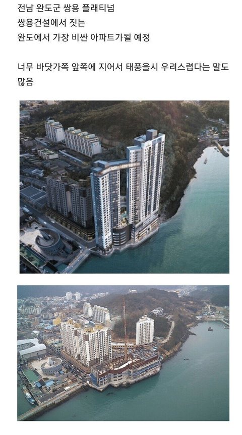 저 뒤에 아파트 주민들은 바다 영구조망이라 생각 했을텐데... 설마 저기에 저딴 고층 아파트가 생길거라 누가 상상이나 했겠냐 뒤 아파트 배려 차원이 아니라 안전을 생각 해서라도 허가가 났다는게 이해가 안 된다. 우리도 이번에 건물 지으려고 하는데 이것저것 사소한거 하나도 꼬투리 다 잡아대면서 수정하라 뭐 하라 해대고 허가 받기까지 꽤 일이 많았는데 무려 바다 코 앞 고층 아파트 허가... 저게 가능한가
