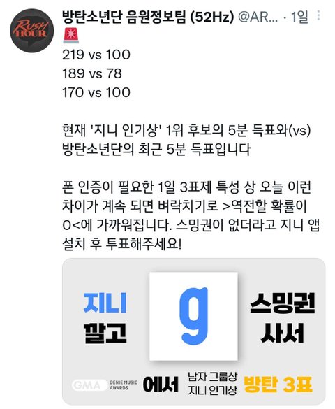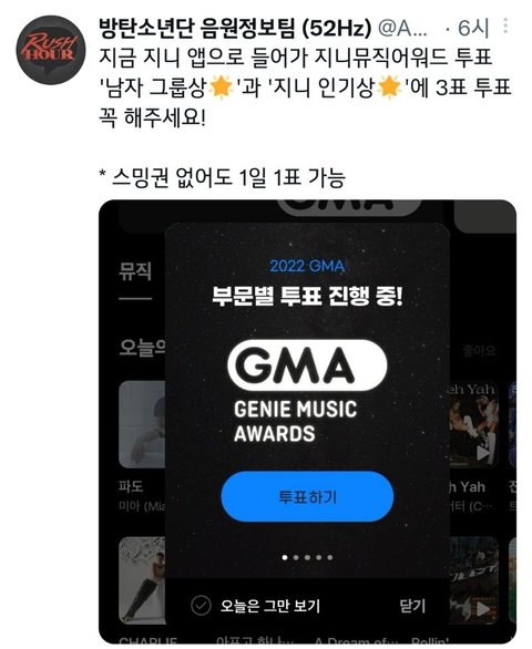 12시전까지 오늘 투표 잊지말고 해주라 https://twitter.com/ARMY52Hz/status/1578301596512833536?t=yr_6mOCb9l7IGrzYc2o_fQ&s=19