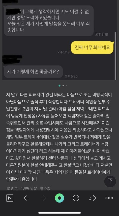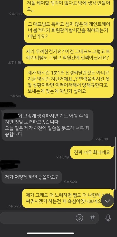 트레이너 지각 3번 반존대 불친절 때메 수차례 트러블 있었는데 중간에 책임자와 직접연락해서 상황전달 하고 교육시키겠다 죄송하다고 하더니 나중에는 트레이너도 자기가 하는 잘못은 빼놓고 말하더라구요 책임자가 저한테 할말 못할말 못하는게 트레이너가 "회원님때메 힘들다던대요" 그럼 저는 즐기나요? 애초에 발생되지 않게 하든가 여태 다른곳에서 PT받으면서 이런적 한번도 없었습니다 다른분도 저랑 똑같은 트레이너랑 배웠을때 30분전 약속 당일캔슬하고 지각일삼고 일이 커질거같으니 트레이너 교체도 이루어졌다고 하더라구요