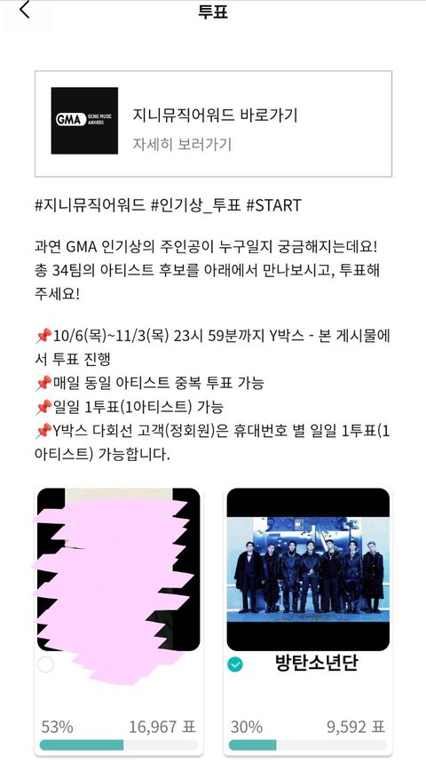 @@지 니 인기상 Y 박스앱 3일차 투표 현황@@