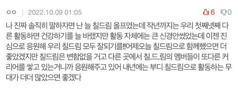 드림 활동에 내 최애가 없으면 너무 서러웠고 드림한테 진심이라서 내 최애의 또다른 커리어활동을 진심으로 응원하지 않고 있나 싶어서 내 자신한테 실망도 했었어…특히 겹멤프는 원치 않아도 싸움에 끼게 되면 이러지도 저러지도 못하는 상황에 늘 죄인이 되는 기분이었는데…우리 드프들이 준표들이 비록 드림활동이 아니더라도 드림멤을 응원해준다는 사실이 너무 감동이야 진짜 나도 제발 내년에는 칠드림으로 더 많이 보고싶다 사랑해