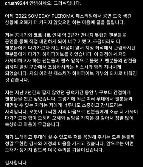 크러쉬가 무대중 팬들에게 하이파이브를 함.