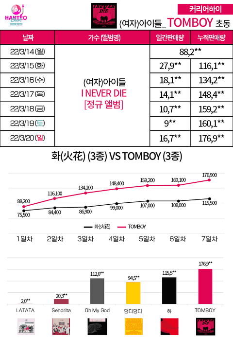 데뷔초동 2000장 - 20일만에 1위 Tomboy초동 17만장 - 탑백 1위(연간1~2위)