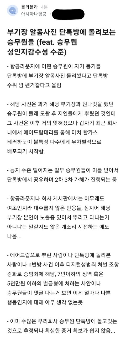 부기장 알몸사진 단톡방에 돌려보는 승무원들