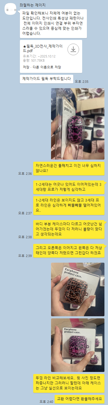 저는 ㅂㅇ이라는 쇼핑몰에서 개인 디자인의 에어팟 케이스를 30개 가량을 주문하였습니다. 해당 제품을 받고보니 택배가 너덜너덜한 건 둘째치고 제품 인쇄 불량으로 보여져 해당 ㅂㅇ쇼핑몰에 문의를 남겼습니다. 아래는 제가 인쇄불량으로 판단했던 케이스 사진입니다.