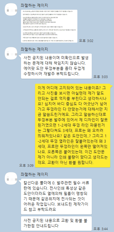 첫번째로 카톡으로 주문을 받을 당시에는 저런 공지를 카카오톡으로 고지해주지 않았습니다. 그리고 추후 안내 받은 공지를 확인해보아도 해당 내용은 저로선 받아드릴 수 없는 공지였습니다.