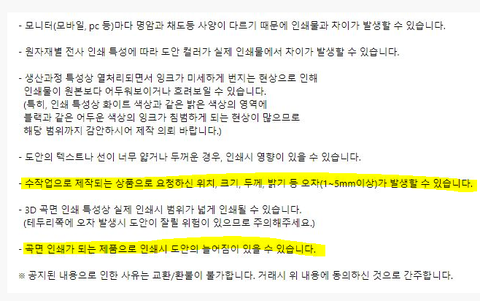 아무래도 쇼핑몰측 입장은 공지에 설명된 늘어짐과 오차 1-5mm발생 여부인 것 같은데. 우선 곡면 인쇄 늘어짐은 무슨 오히려 옆면이 떨어져있습니다. 그리고 주문한 에어팟 케이스 중 가장 큰 에어팟 프로 기준 케이스 사이즈는 45.2 x 60.6 x 21.7 mm입니다. 10cm도 되지 않는 케이스의 5mm이상 오차라니요? 이건 아예 디자인이 대각선으로 찍히든 옆으로 밀리든 오차 공지했으니 구매자는 불량이어도 감수해야되는 부분일까요.