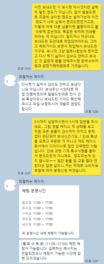 제가 글을 작성하게 된 가장 큰 이유입니다.. 쇼핑몰의 회피. 상담시간 17:00를 알고 있고 답변을 기다리고 있는데 오후 5시에 딱 맞춰 답변을 보내주셨더라고요. 내일 답변을 받아도 환불이 어렵다는 공지뿐이겠지요. 현재 위 사진처럼 소비자보호원에 분쟁 조정 신청을 제출하였습니다. 잘못이라면 샘플 주문하지 않은 제 잘못도 있겠지요.. 다른 사업자나 개인 제작자 분들은 저처럼 피해없길 바라시며, 추후 환불을 받았는지 다시 글 작성하도록 하겠습니다. 긴 글 읽어주셔서 감사합니다.