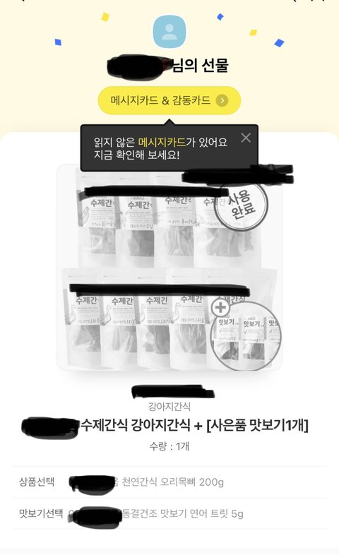 지난 2022년 9월 22일 지인에게서 카**** 선물하기를 통해 아***펫 간식회사 브랜드 수제간식을 선물로 받았습니다