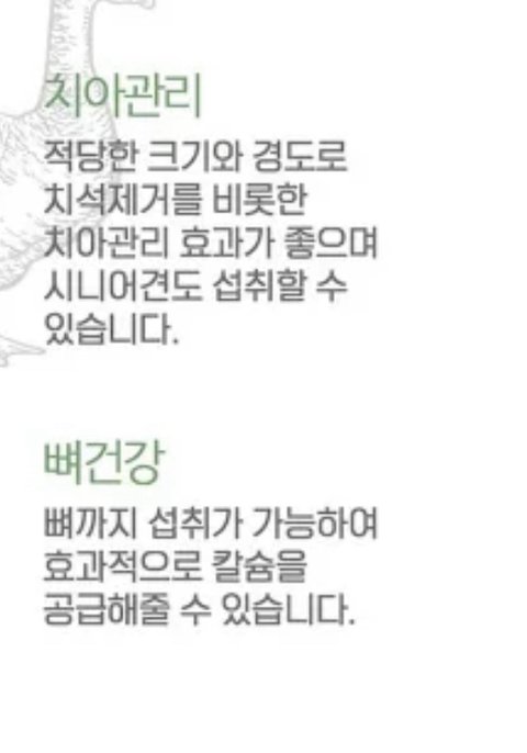 "시니어견도 섭취 가능"이란 글귀와 치석제거와 칼슘을 위해 뼈까지 섭취 가능하다는 글, 강도의 정도 확인 후 선물하기 받았습니다.