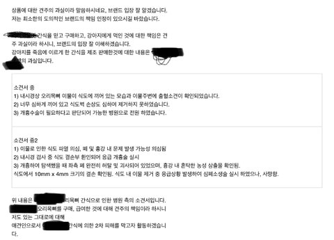 수차례 메일을 보냈으나 안타깝지만, 상심이 크겠지만 형식의 답변만 왔고 주의 사항에 보호자의 감독하의 감독 하에 급여하란 내용이 있었다며 해당간식에 대한 어떠한 대처도 내놓지 않고 있습니다.