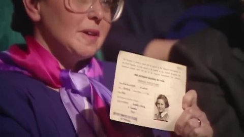 이번엔 윈턴의 왼편에 앉은 여인이 자신도 윈턴의 도움으로 구조됐다면서 문서를 들어보이고 있다.