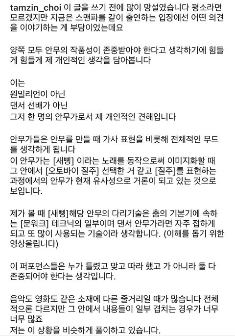 근데 이 논리대로면 카피라고 불릴정도로 유사한 안무를 창작이라고 내놔도 존중받을 수 있다는 의미같아서 좀 이상한듯 ㅋㅋㅋ 이러면 나중에 누가 최영준님이 짠 안무랑 유사한거 만들어서 내놔도 표절은 아닌거잖음 괜히 이런 글 남겨서 다른 사람이 최영준님거 카피해갔을때 할말 없을까봐 걱정임