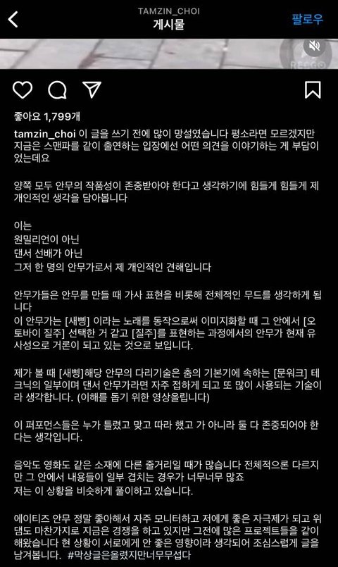 2. 어떤 사람들은 흔히 쓰이는 안무 하나가지고 유난이네 하는데 다른 어느 누가 춘 적 있다는 예시가 아무것도 없음