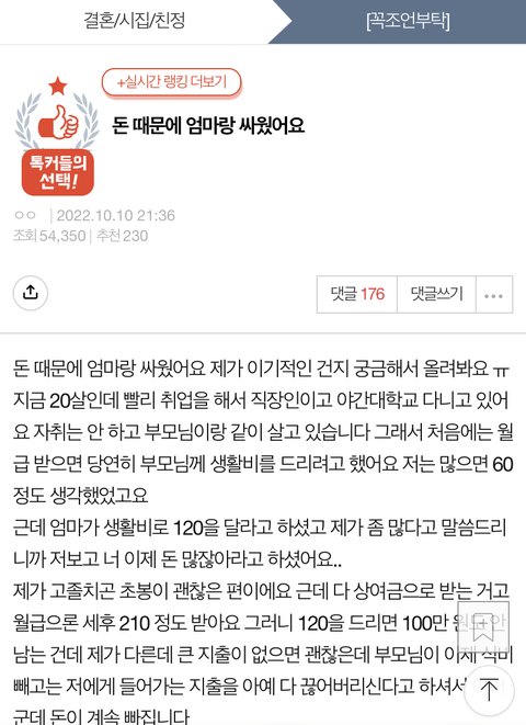 저번에 사진의 글 올린 사람입니다 남동생이 올린 글을 읽어 엄마한테 보여줘서 내렸네요ㅠ 엄마랑 또 싸웠지만 다행히 내년부터 회사 근처에서 자취하기로 했습니다 이야기를 하면서 엄마는 반대할 줄 알았지만 남동생도 반대하길래 이유가 궁금했는데 자기 영어 과외부터 내년에 들어갈 고등학교 학비까지 제가 내던 돈으로 할 계획이라 반대하던 거였어요 ㅋㅋ 제가 ATM기기도 아니고.. 이야기 듣고 타 지역에 계시는 아빠한테 말하니까 아빠는 전혀 모르고 계셨고 아빠가 더 이상 엄마한테 제 월급 주지 말라고 하셨습니다 엄마랑 동생은 저 나쁜 년 취급하길래 아빠랑만 연락하면서 지내려고 합니다 댓글로 조언 주셨던 분들 감사드려요^^