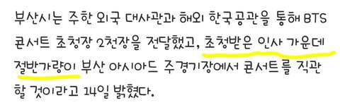 결론만 말하자면 방탄 부산콘은 싹다 매진이었고 공석은 부산시와 기업들이 빼간 몇천장의 초대석들을 풀지 않아서 생긴 공석임