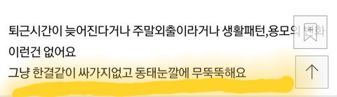 퇴근시간이 늦어진다거나 주말외출이라거나 생활패턴,용모의 변화 이런건 없어요