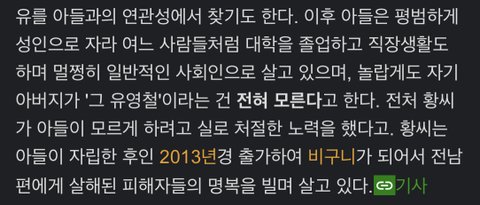 이거ㄹㅇ인게 예전에 sbs방송에서 범죄자 자식들 근황 알려주는 프로그램 제작했는데 그 강호순이랑 오원춘? 아들이랑 통화 녹음한거까지 내보내는 ㄹㅇ노빠꾸 방송이였음ㄷㄷ 근데 유영철 아들만 유일하게 자기 아빠가 범죄자인거 모른다고 제작진들도 다 놀랐을걸? 나중에 인권위원회에서 항의해가지고 다시보기 영상 싹 다 내려감ㅋㅋ