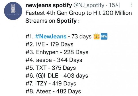뉴진스 스포티파이 4세대 최단기간 2억스밍 달성