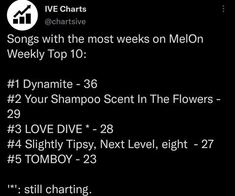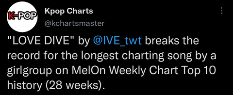 아이브 LOVE DIVE 걸그룹 멜론 주간 TOP 10 최장기간 차트인 기록 갱신