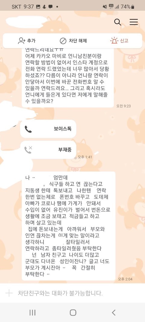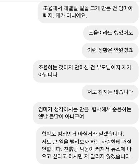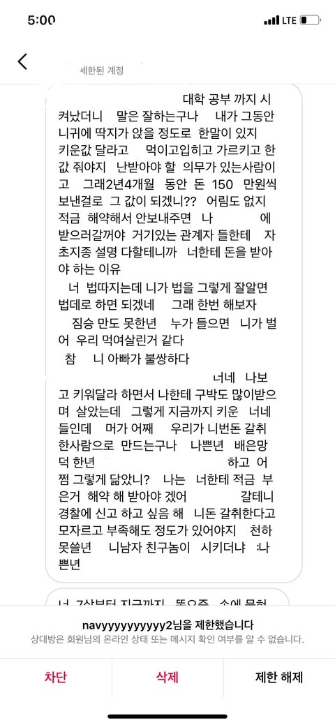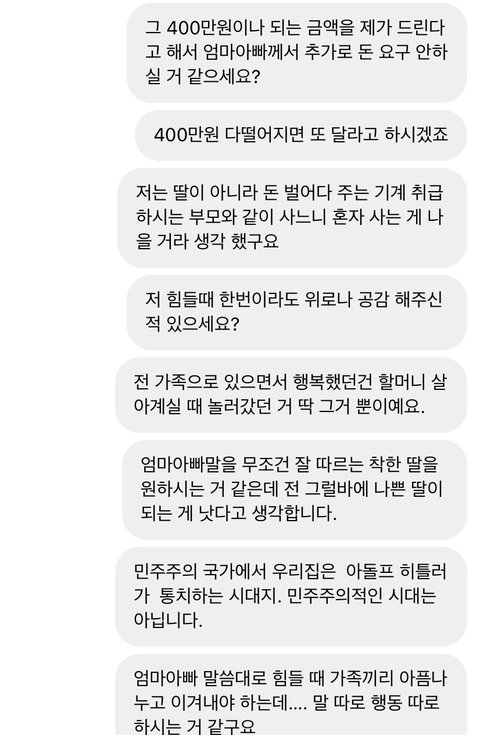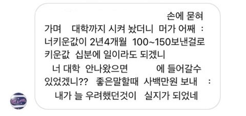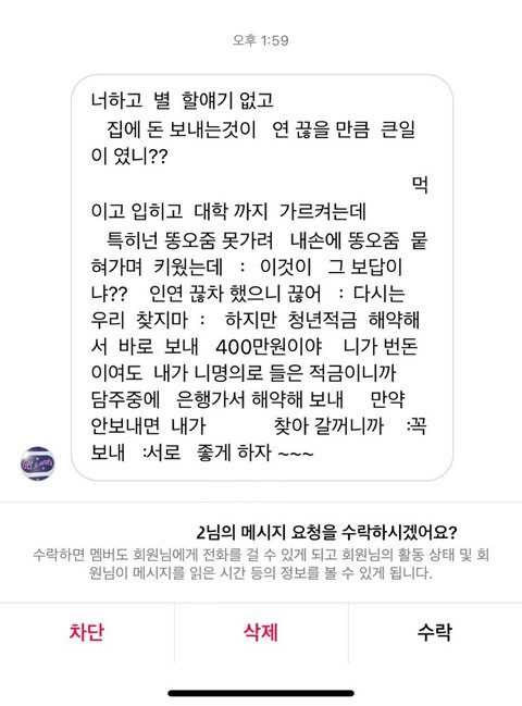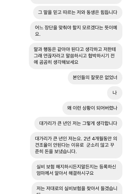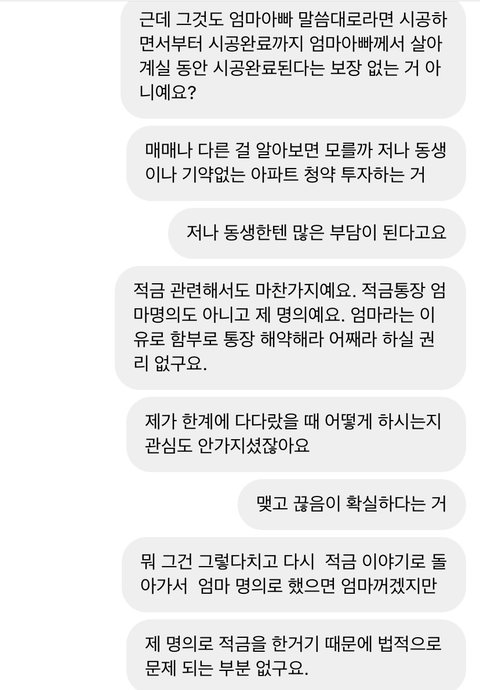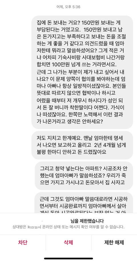 *음슴체 주의*두서없이 쓴 글이니 양해부탁드려요.난 20대 직장인이고 가족 (나 포함) 4명임. 본가와는 거리가 좀 멀어서 나는회사기숙사에서 출퇴근함. 내가 현직장에 입사 후 아버지 가게가 코로나 떄문에 잘 안되서 내가 첫월급 때부터 현재까지 150~180만원 보내드리고 남은 6~80만원으로 낼 거 다내고 쪼들리게 살고 있음. 직장이 산 속이고 직장에서 시내까지 가는 버스가 잘 없고 카카오T로도 잘 안잡히는 데라 콜택시 부르고 해서 외식비보다 교통비(택시비로 직장에서 시내까지 왕복 5만원 정도) 지출이 매우 커. 입사 초에 오랜만에 본가와서 엄마한테는 내가 지금 쓰는 돈으로는 부족하다고 내가 감당할 수 있는선에서 집에다가 돈 보내면 안되겠냐고말씀을드리니 화를 내면서 욕설과 함께 "너가 뭐에 쓰길래 부족하니? 시골에서 뭐 얼마나 쓴다고." 라고 말씀하시면서 화를내는 거임. 그래서 내가 "회사가 산속이니까 근처에 편의점도 없고 해서 웬만한 건 한 번 시내 갔을 때 한꺼번에 사와야 하고 일일단 본가처럼 자주 다니는버스도 없을 뿐더러 버스 시간 텀 길고 탄다고 한들 바로 멀리멀리 돌아서 도착해요. 택시 요금도 본가보다 비싼 편이구요. " 라고 말씀을 드렸는데도 이해를못하시더라구 그러다가 기숙사로 짐 옮기러 아빠 차에 물건 다 실어놓고 직장 기숙사에 도착하니 "아~그럴만도 하겠네." 이러시는 거임. 여기까지는 뭐 괜찮아. 내가 최근에 가족들과의 연을 끊어야 겠다고 결심 한 이유는 S시 P구 재계발 지역이 있는데 그지역에 시공하고 있는 아파트 청약을 들어갈 건데 엄마가 따로 모아둔 청약통장이랑 은행대출해서 분양을 받고 시공하면서 나가는 추가적인 부분은 동생과 나 적금 모은 거(청년적금)만료되면 그걸로 내겠다고 말씀하심. 난 반대라 하니까 "뭐 우리가 죽어서 가져가냐? 너네들 위해서 아파트 산다는건데 우리 죽으면 너네 명의 해줄꺼야." 라고 했지만 난 전혀 신뢰가 안갔음. 쓰니 본인은 월급날마다 월 150~180만원 보내고 남은돈으로는 자기계발 꿈도 못꿈. 요새 학원비(최저가 딱 내 한 달 생활비)도 비싼데 그거까지하면 난 마이너스가 됨. 그래도 집이 어려우니까 돈을 아예 안보내겠다는 것도 아니고 내가 부담이 되지 않는 선 50만원 정도씩 보내드리겠다고 했더니 이 세상에서 안들어본 욕이 없을 정도로 욕을 많이 들음. 2년 4개월까지 꾸준히 보내줬고 협의를 할려고 했으나 엄마는 고집을 꺾지 않으시고 통보하고 명령어 쓰심. 그럴 때마다 아빠한테 중재 요청을 하였으나 회피하시고 엄마 말씀에 잘 따라달라고 하시네.... 진짜 말이 안통하고 그게 지속이 되다 보니까 몸도 마음도 지치고 번아웃이 와버리고 가족들한테 돈 버는 기계 취급 당하는 기분임.... 내 성격 상 아닌 건 아니다 라고 말하는 성격이고 맺고 끊음이 확실한 성격이라 협의제안도 내가 먼저 이야기 했으나 엄마의 협박 및 폭언이 날라옴. 내가 더 이상 정신병이 걸릴 거 같아서 전화번호 변경 후 전입신고도 함. 가족들한테 번호 변경 사실을 알리지 않음.그러더니 며칠 전인가 그때 동생 인스타 dm 으로 엄마가 연락을 하셨는데 욕설 과 협박을 하면서 연끊을 거면 내가 모은 청년적금 모은 거 (400만원) 모은 거 내놓으라 함.근데 난 거절함. 그랬더니 직장으로 찾아와서 상황설명하고 꼭 돈을 받겠다는 식으로 말하길래 차단함. 그리고 과장님이랑 국장님한테 상황설명 드린 후 캡쳐한 거 보여드림.(이후에 온거 제외) 다행히 조치를 취하시겠다고 하셔서 마음이 안정이 되기는 한데 한 편으로는 불안해....어떻게 해야할까.....