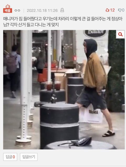 자기는 대왕짐 들고 매니저한테만 조그마한 파란짐 떠넘긴다고? ㅊㅋㅋㅋ차라리 재현이 매니저 짐 들어줬단게 맞겠다
