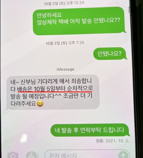 저녁까지 답장이 없어 다시 물어봤고 21.10.05일부터 순차적으로 보낸다 함.