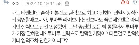 얘네 꼭 타 팬인데로 시작해서 인증도 못하더라 이렇게 말하는 타팬이 어디있는데ㅋㅋ