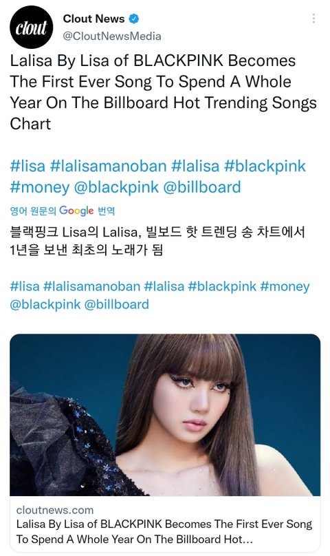 블랙핑크 리사 52주 연속 미국 빌보드 핫 트렌딩 송즈 차트에